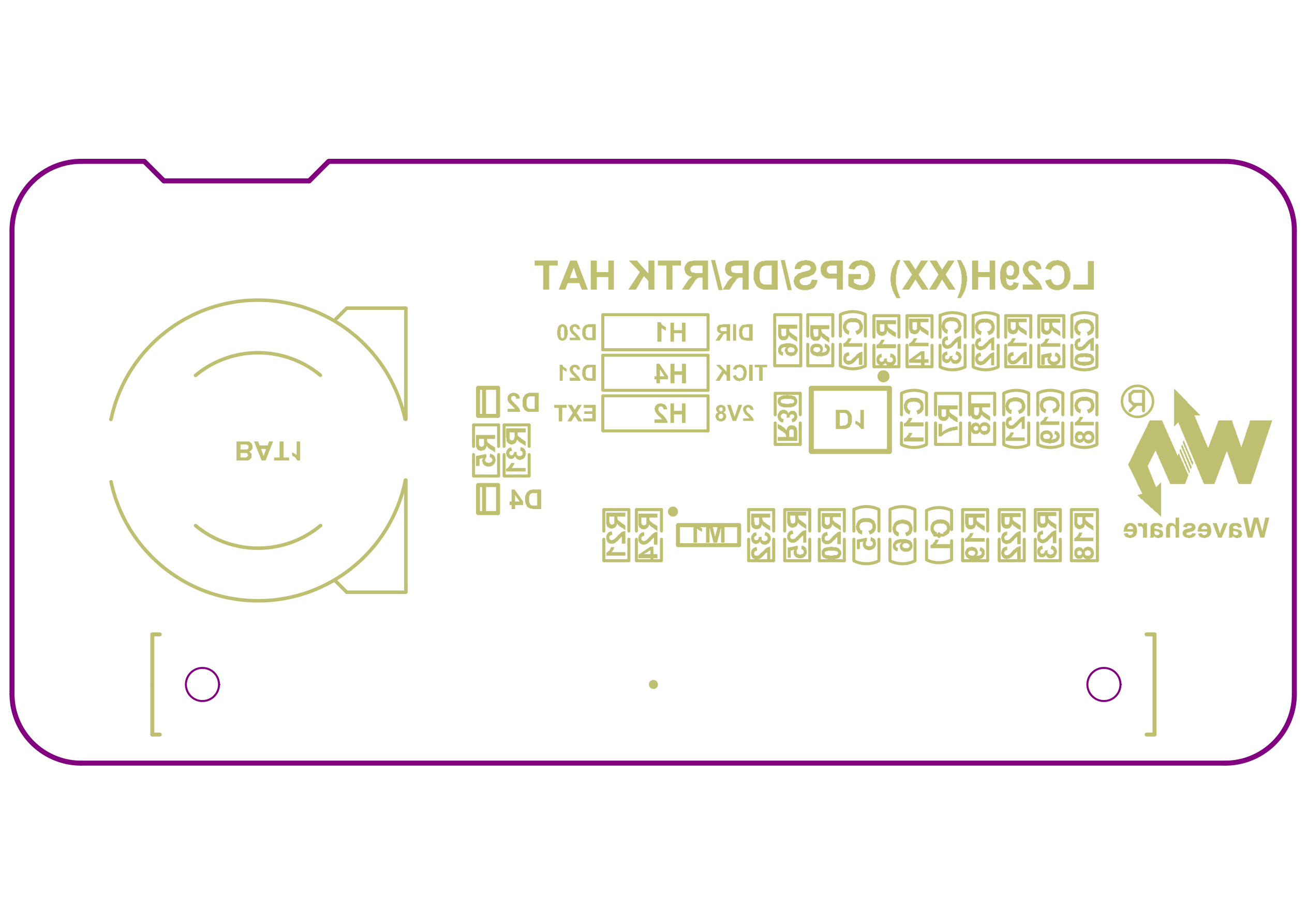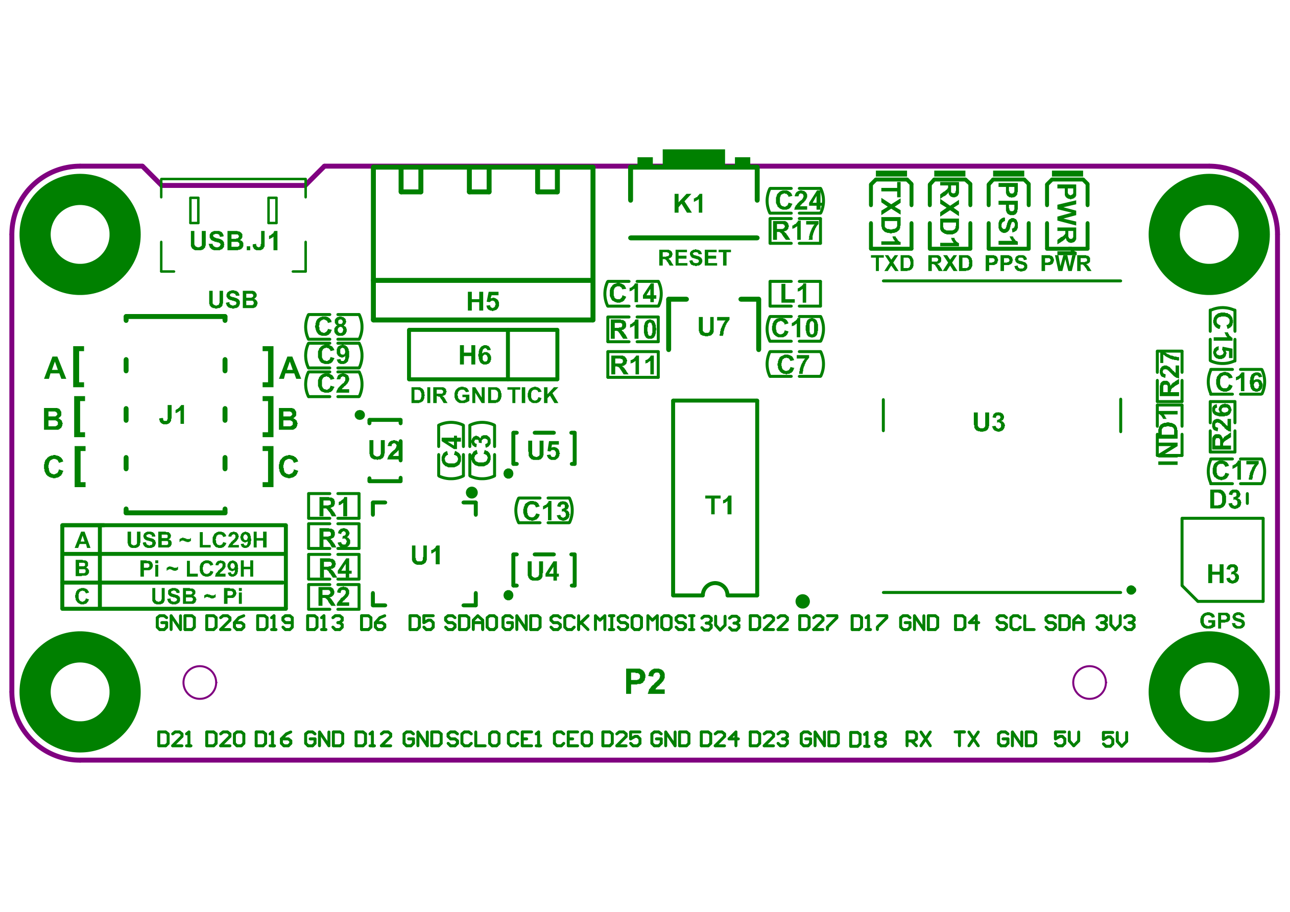 Section titled “PCB Layout — Top”Component placement on the front of the board. The LC29H module occupies most of the right side, with the USB connector and jumper block on the left.