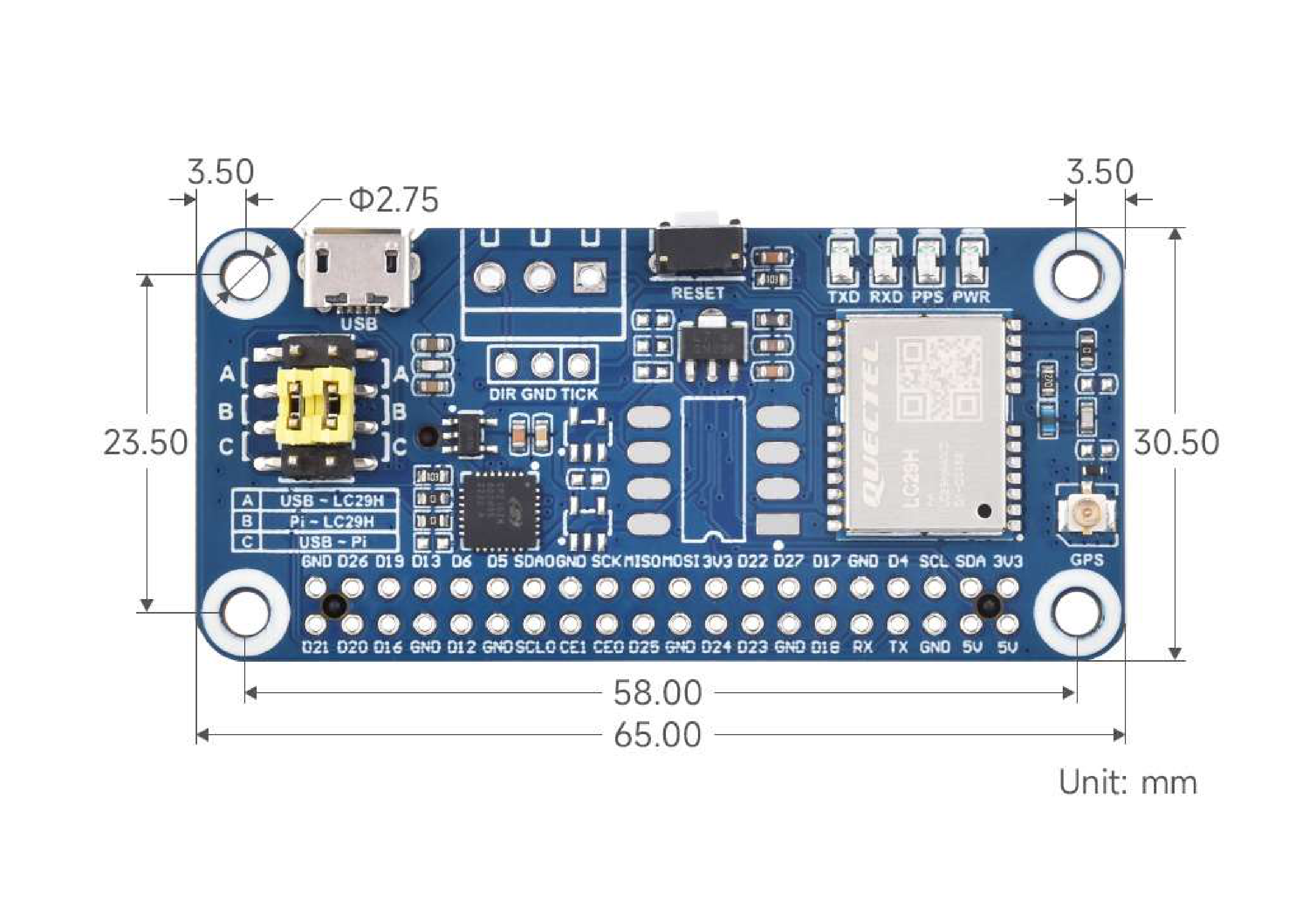 | GNSS module | Right | LC29H, IPEX antenna connector, ESD clamp |